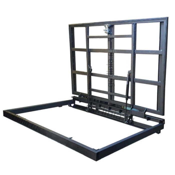 Скрытый короб из профиля 50х25 без наличника крепят в торец плиты (лагу) на расчетную отметку над уровнем чистовых полов. Со стороны оси открывания на паразитку приходит деревянный пол до 35 мм с подрезкой в четверть 15 мм, отступом 4-6 мм от края полки по месту. Дверь обшивается доской 25 мм с запилом торца на угол, как на схеме, для свободного хода двери на газовых амортизаторах до угла распахивания 88° при зазоре 2-4 мм на петлевым узлом.