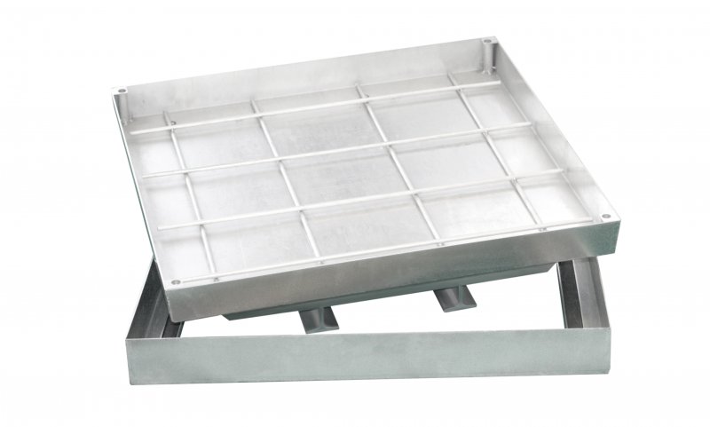 Обвязка из арматуры Ø 8 мм опирается на посадочное основание каркаса ляды, принимает нагрузку и перераспределяет на корпус.Тяжелая крышка прижимает резиновый уплотнитель в посадочное ложе, раскрепленное анкерными болтами в опалубке. Для доступа в смотровой колодец Вы вывинчиваете шестигранником 4 шпильки из уголков крышки с втулками, вворачиваете инструмент открывания и поднимаете корыто вручную.