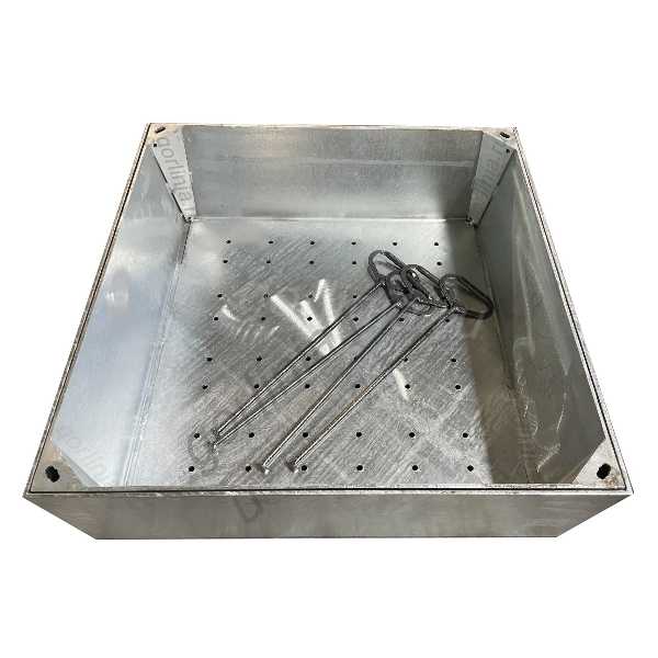 Полую крышку зацепляют через отверстия по углам и вынимают специальными крюками. Закажите исполнение с крепежными ушами (пластинами) для удобства монтажа и выставления в уровень земли. Усиление каркаса корыта профилем является доп. опцией (см. галерею фото)