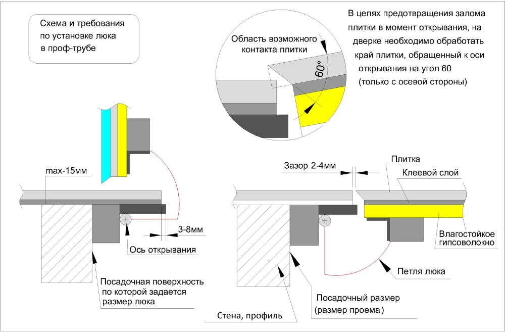 Внимание! Допускается вылет плитки за размер полотна 780х478 по ширине и по нижней до 10 мм. Сторону петли необходимо заточить под углом 45-60° для бесконтактного открывания шарнира с одной осью вращения.