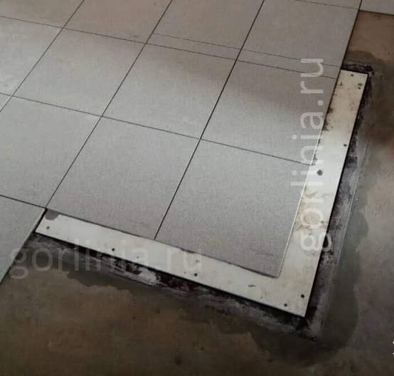 Каркас полотна сварен из трубы 30х20 в комбинированных положениях с заполнением ГВЛ в уровень коробки под облицовку плиткой по принципу невидимки с сохранением рисунка и швов раскладки керамогранита в комнате. Для открывания лаза в погреб 1150х700 используется съемная ручка.